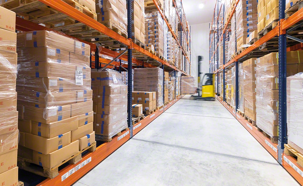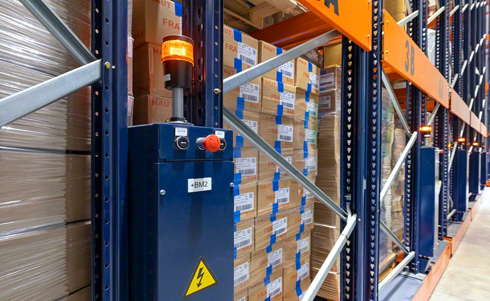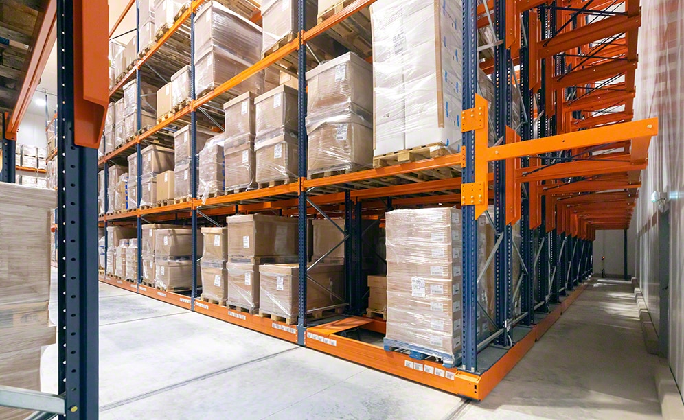 Mecalux l'a équipée de sept rayonnages doubles sur bases mobiles Movirack de 9,5 m de haut et 26 m de long. L'élément le plus important de ce système est qu'il exploite au maximum l’espace disponible pour obtenir la plus grande capacité de stockage possible (ici 1 816 palettes de 850 kg chacune), sans perdre l’accès direct à chaque palette. Les rayonnages sont posés sur des bases mobiles qui se déplacent latéralement en toute autonomie. Comme il s'agit d'un système par accumulation, il permet de réduire le nombre d'allées de travail. L’opérateur doit simplement utiliser une télécommande pour donner l’ordre d’ouvrir l’allée requise afin d’extraire ou de déposer la marchandise à son emplacement.