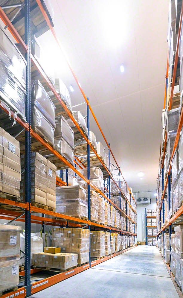 La chambre de congélation de Sabarot à Chaspuzac (France) dispose de rayonnages sur bases mobiles Movirack de Mecalux de 9,5 m de haut. Cette solution exploite au maximum toute la surface disponible afin d’obtenir une plus grande capacité de stockage et réduit la consommation d’énergie pour générer du froid. Au total, il est possible de stocker 1 816 palettes avec tous les produits finis.